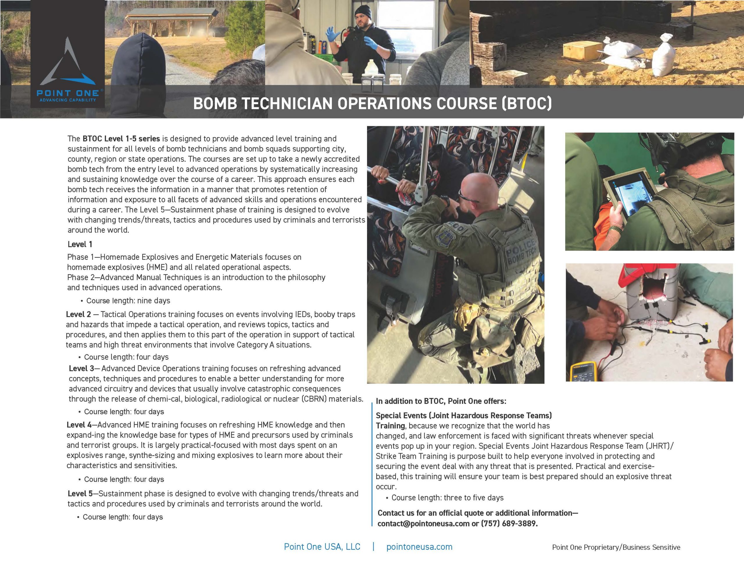 The BTOC Level 1-5 series is designed to provide advanced level training and sustainment for all levels of bomb technicians and bomb squads supporting city, county, region or state operations. The courses are set up to take a newly accredited bomb tech from the entry level to advanced operations by systematically increasing and sustaining knowledge over the course of a career.