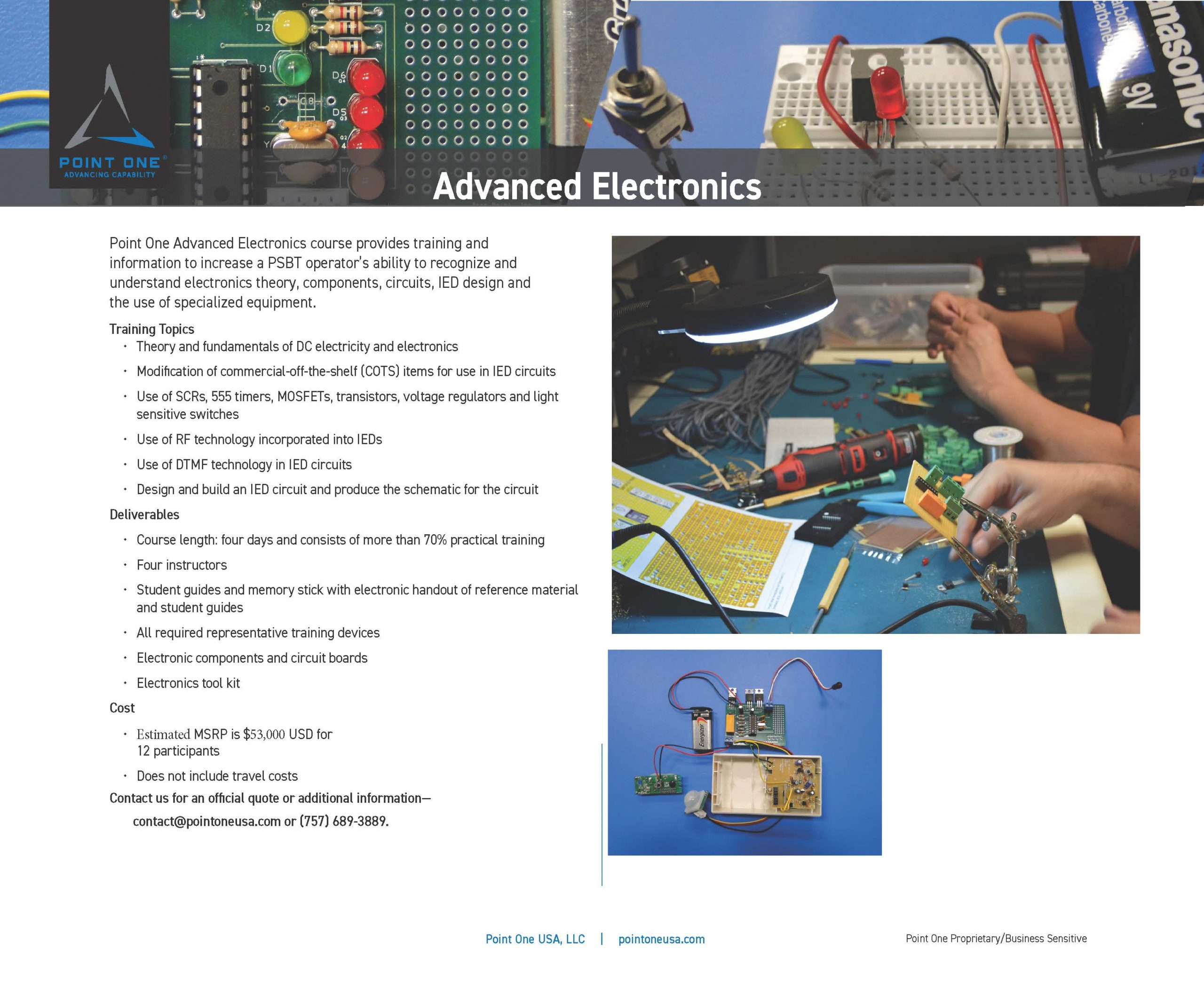 Point One’s Advanced Electronics courses provide training and information to increase PSBT operator’s ability to recognize and understand electronics theory, components, circuits, IED design and the use of specialized equipment.