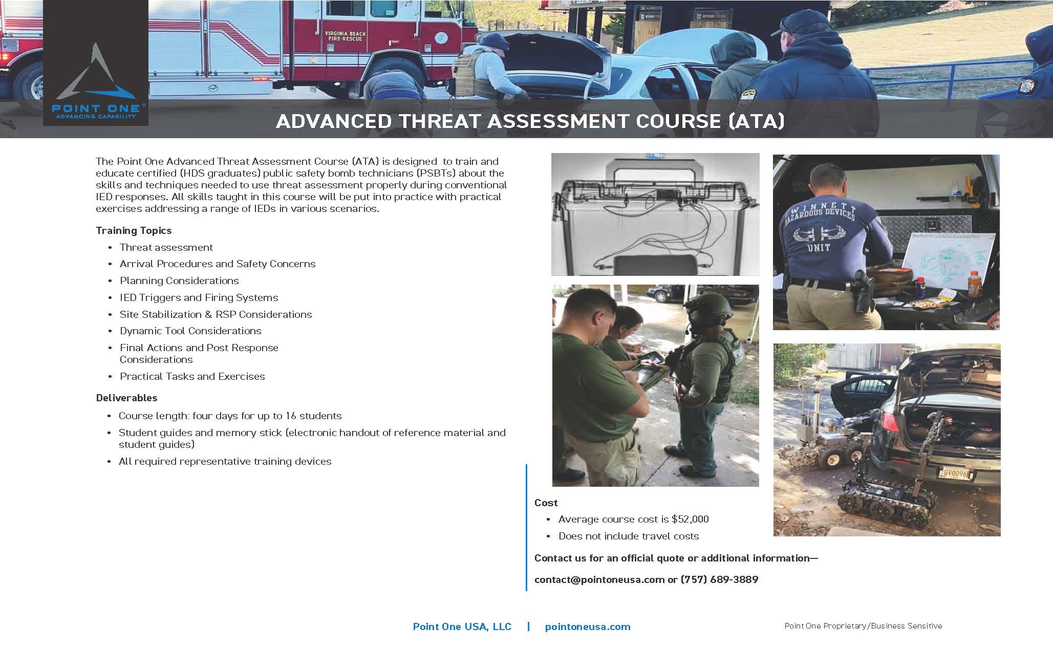 Point One’s Advanced Treat Assessment (ATA) courses are designed to train and educate certified (HDS graduates) public safety bomb technicians (PSBTs) about the skills and techniques needed to use threat assessment properly during conventional IED responses.