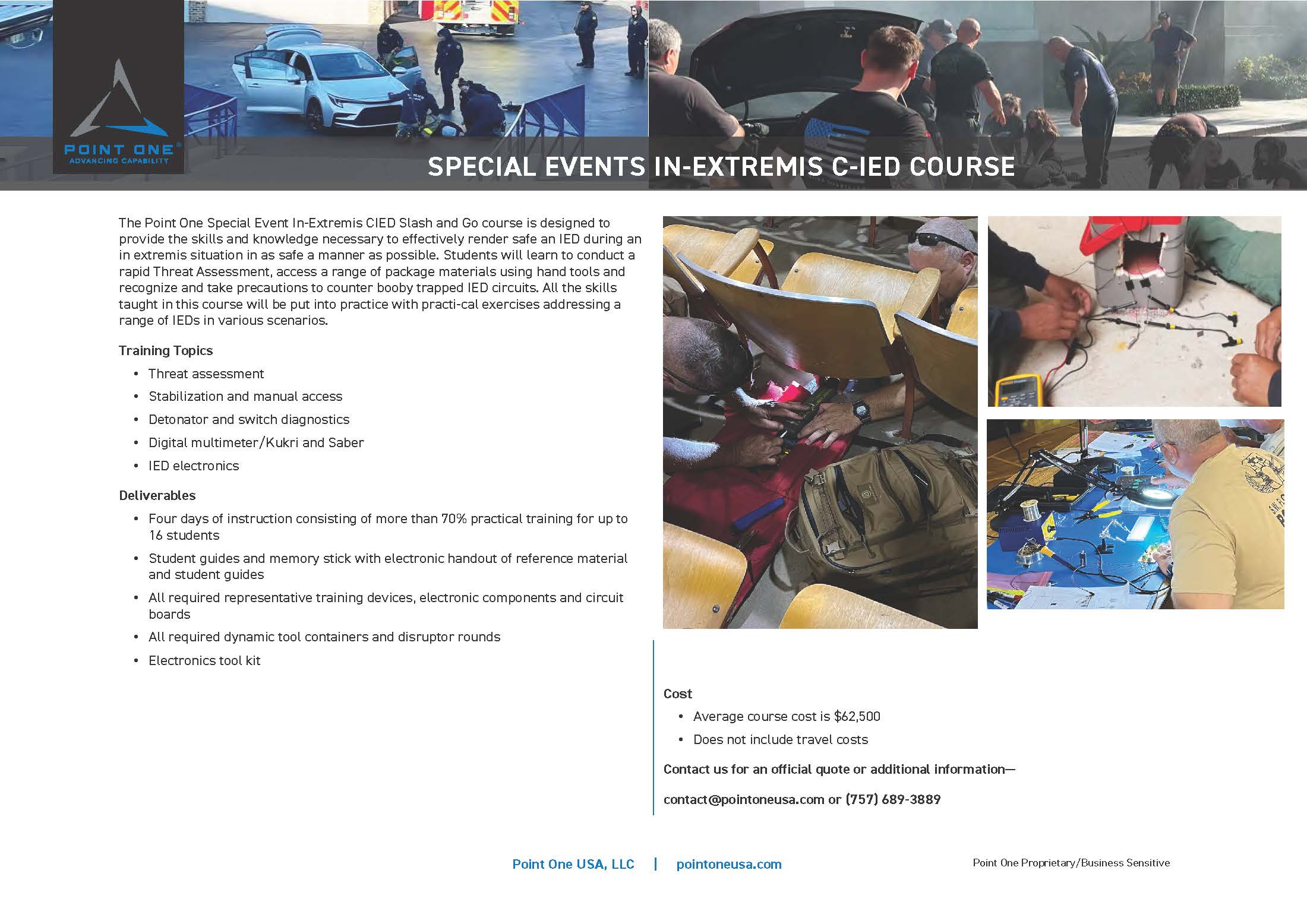 Point One’s HME courses provides training and information to increase an EOD operator’s ability to handle, test, identify, neutralize, render safe and dispose of explosive compounds used in improvised explosive devices (IED) across the operational spectrum.