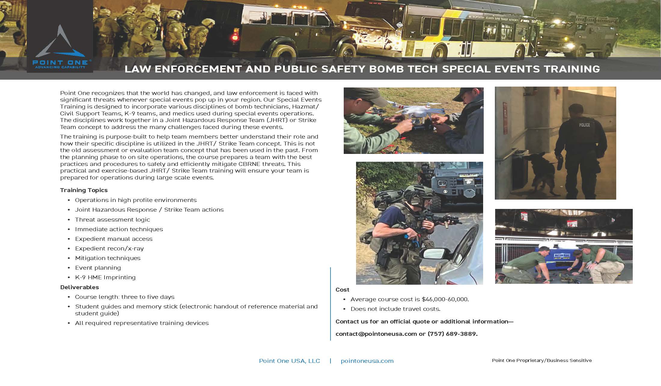 Point One designs courses to train Public Safety Bomb Technicians to conduct procedures in all operational environments, from conventional to tactical and in-extremis. We provide the training you need.